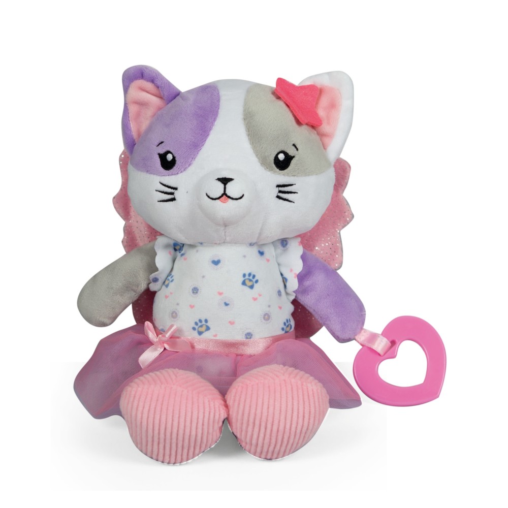 Katy, a cuki plüss cica gyermeked hű társa lehet. A plüss különböző textúrájú anyagból készült, így a tapintás során remekül fejleszti gyermeked szenzoros képességét. A cica kezében egy cuki lila korona formájú rágóka is található, mely a fogzás időszakában segítség lehet.